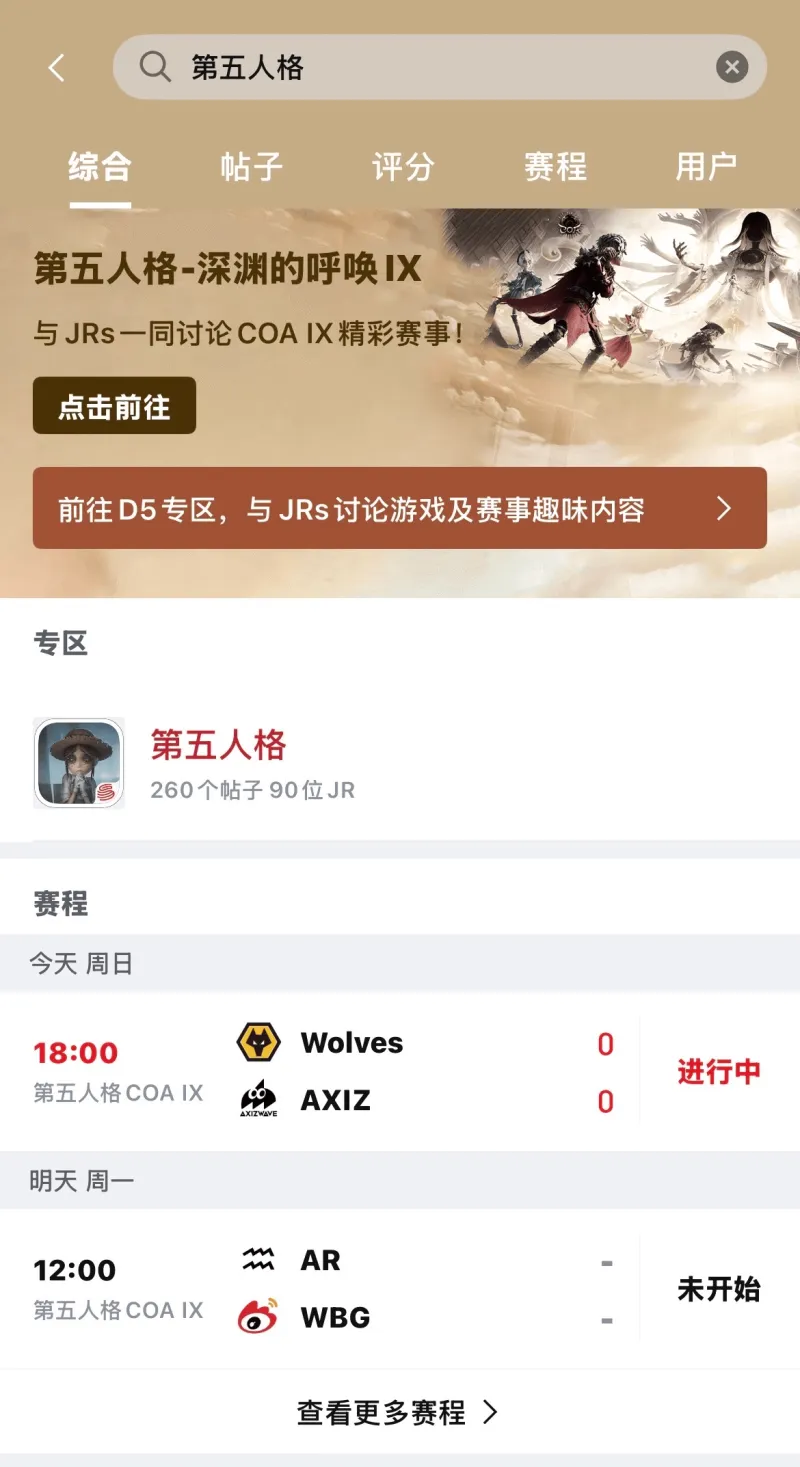 上虎扑搜索【第五人格】、【COA】,完整赛程、赛后评分、高光瞬间一网打尽,更有诸多或精彩或趣味内容等你来发掘!